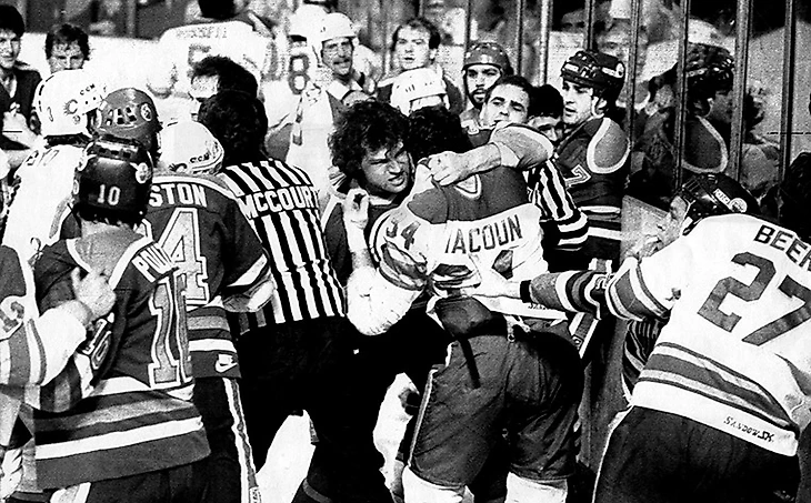 Дальше – хуже. Моя карьера достигла отметки, когда я знал, что не буду играть. Брофи держал меня в составе лишь по одной причине: бои. К тому моменту, за всю мою спортивную жизнь, меня ни разу не отправляли на лёд чтобы драться. С моей стороны все всегда происходило спонтанно. Теперь об этом можно было забыть. Однажды, наш центральный нападающий Эд Ольчик «словил» удар локтем от Бэйсила МакРэ. Для Брофи сигнал был предельно простым: «Так, Эдди, быстро убирайся со льда. Дэйв, а ты на площадку. Позаботишься об этом товарище». Но мне это было не нужно. Я не чувствовал себя комфортно, не чувствовал, что у меня сносит крышу. А пока я спокоен, все мои физические действия не отличаются особой эффективностью. Зато этот седой тип за моей спиной без остановки продолжал орать: «Пошёл! Пошёл! Пошёл!».