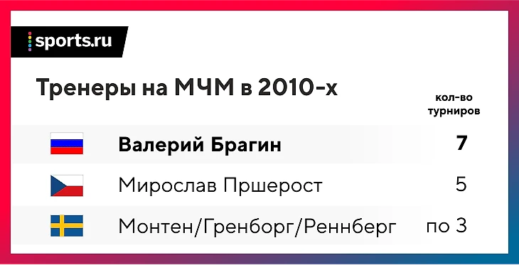 Загибайте пальцы: Валерий Брагин был главным тренером сборной России на ЮЧМ-2004, МЧМ-2011, 12, 15, 16, 17, 18 и будет в 2019-м – это без ассистентских историй (с ними получается совсем много). В сумме это восемь турниров – семь, если брать только молодежку. Брагин – самый опытный мужик среди тренеров большой шестерки, если считать с 2011-го.