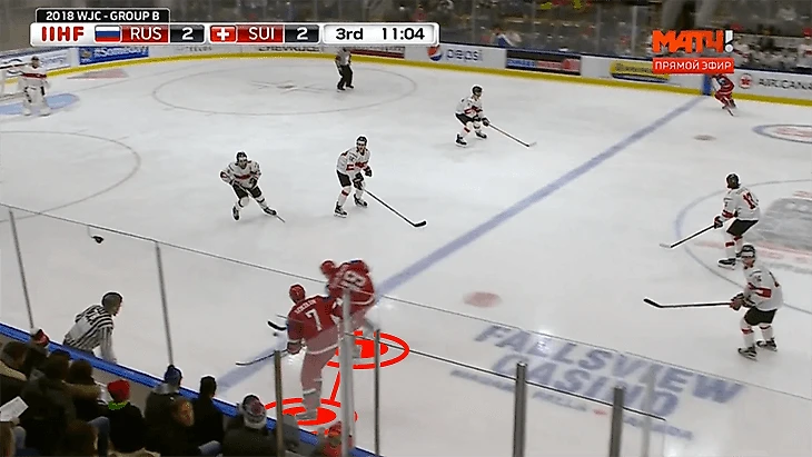 Выход из обороны максимально простой: один из крайних нападающих несется в среднюю зону и ждет передачи от защитника. Если все успешно, то он либо входит в зону сам, либо делает вброс, либо отыгрывается с партнером – и тогда они въезжают в зону вдвоем. Это просто и достаточно эффективно, но дальше вариантов практически нет: один или два наших нападающих с шайбой заперты у борта без адресов в центре.
