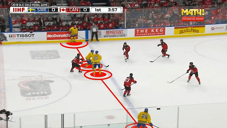 Базовая установка на простоту приводит либо к забросу за чужие ворота, либо просто к потере шайбы и откату в среднюю зону. На фоне шведов, которые разгоняются в средней за счет смены мест, коротких передач и просто дриблинга, а потом залетают в чужую зону по четверо, наш стиль выглядит архаичным. Вот так Швеция играла в финале-2018 – который был просто великолепен - против канадцев.