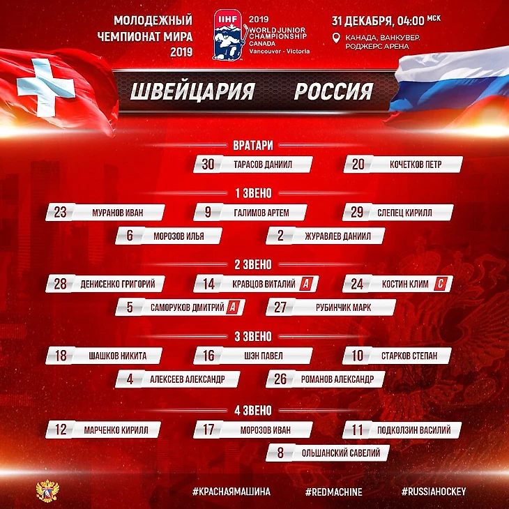 22.00 Всем привет и с наступающим Новым годом! Теперь праздничные каникулы наступили у всех, а значит, можно развалиться на диване и насладиться еще одним матчем нашей молодежки. Сегодня играем со Швейцарией, и этот матч вы можете посмотреть прямо у нас на сайте.