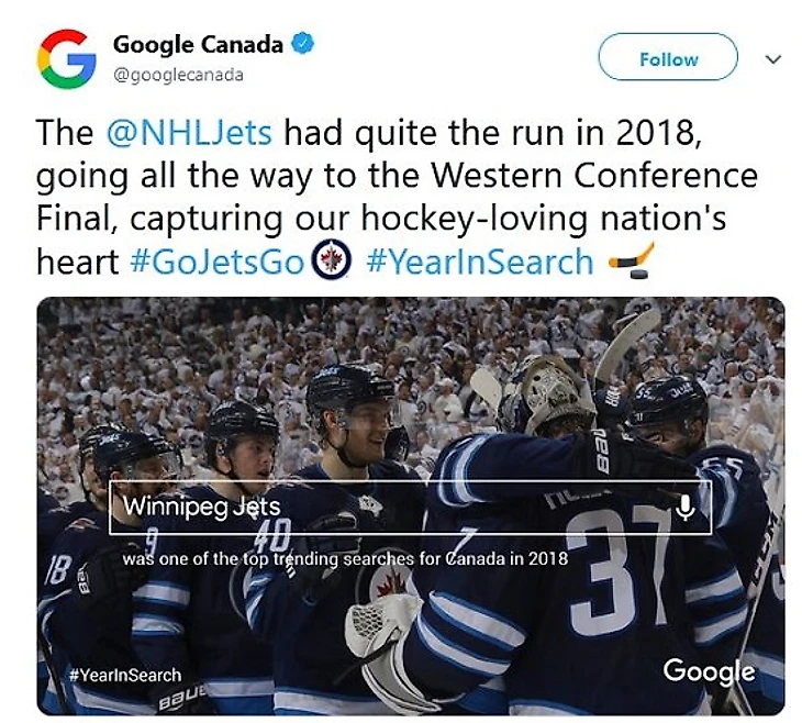 Твит месяца: согласно статистике Google «Виннипег» стал одним из самых популярных поисковых запросов в Канаде по итогам 2018-го года