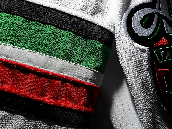 В прошлом году мы использовали самую классическую схему размещения графики на джерси. В этом сезоне дизайн также остался традиционным, но нарукавные полосы поднялись выше и стали крупнее. Кроме банальной ротации, такой шаг обусловлен функциональным дизайном. Более крупные цветовые вставки помогают выделить белую форму дивизиона Чернышева – без них она растворится на фоне льда.