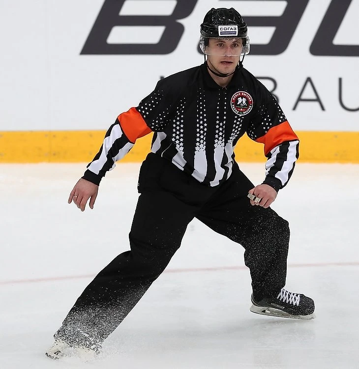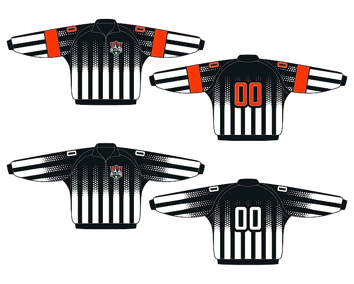 Чтобы поддержать единый стиль мероприятия, звездный паттерн мы применили и в форме арбитров. Черно-белые полосы плавно переходят в черный. Графические градиенты востребованы в футбольной экипировке, но могут быть уместны и в хоккее.