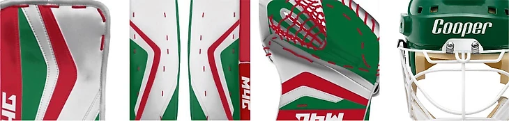 Комплекты щитков учитывают дизайн формы. Сорокин сыграет в черном с красно-зеленой графикой. Для белой формы Бобкова соответственно подготовлен белый сет. Пока до сих пор непонятно в каких шлемах сыграют вратари, но я надеюсь, что Сорокин и Бобков согласятся выйти в однотонных масках. Да, дефолтные чёрная и белая маски при определенных условиях могут смотреться очень стильно. Минималистичный дизайн формы поддерживают однотонные шлемы, усиливая обратный эффект. На контрасте с вычурной аэрографией эти маски будут выглядеть актуально и свежо.