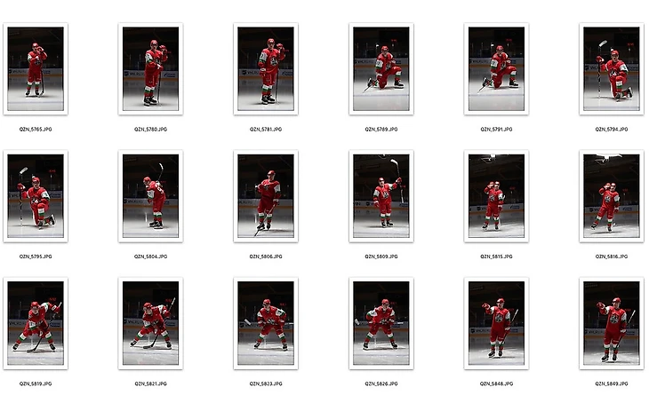 Непосредственная работа с хоккеистами – один из самых сложных этапов проекта. В этом году мы постарались сделать презентацию чуть более живой и динамичной. Показали классические игровые сцены: празднование голов, благодарность за классный голевой пас, приветствие болельщиков на трибунах и прочее. Для нас было важно, чтобы игроки отработали не только позы, но и эмоции. И в этом компоненте нашим звездам, конечно, нужно добавлять. Зато совершенно по-новому для меня раскрылся Никита Гусев. Я с трудом сдержался, чтобы не использовать все его фотографии в презентации. Каждый кадр – гол. Побольше бы таких звезд в КХЛ.