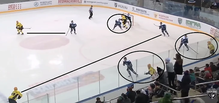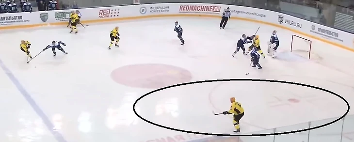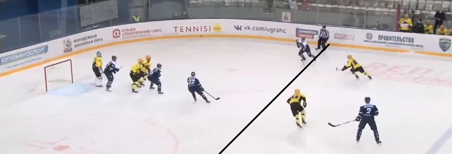 В свою очередь двоих прессингующих нападающих Югры карагандинцы легко проходили за счет паса, как длинного, так и короткого. Так же игроки Сарыарки для выхода из под прессинга использовали перевод шайбы на другой борт.
