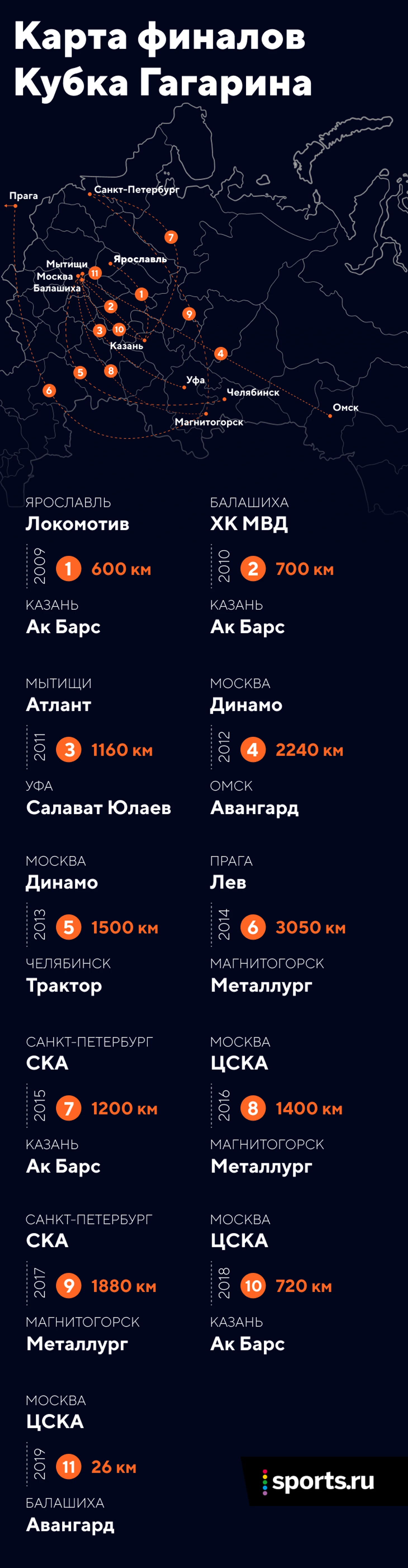 Главная причина такой удобной логистики для финалистов – «Арена Омск», которая еще в августе 2018-го была признана аварийной. «Авангарду» пришлось срочно искать дворец для игры в сезоне – и в итоге омский клуб перебрался в Балашиху. Если б ситуация с разрушением домашней арены не произошла, то расстояние между городами-финалистами было бы таким же, как в 2012-м – 2240 км.