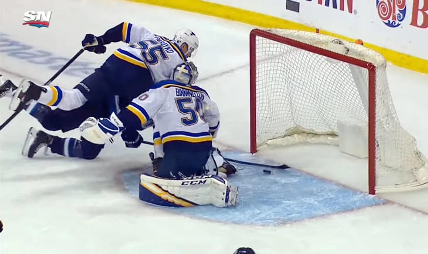 На обратном движении клюшкой Кевин все-таки попал по шайбе, но вместо гола вынес ее с ленточки ворот: