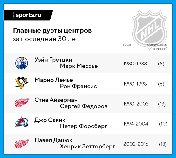 При этом, помещая обмен Малкина в категорию «этого не может быть, потому что не может быть никогда», надо напомнить неприятное обстоятельство для фанатов и менеджмента «Питтсбурга»: большинство звездных дуэтов центров не заканчивало карьеру в одном клубе в один день. Они все рано или поздно прекращали существование: из-за травм, контрактных споров или обменов: