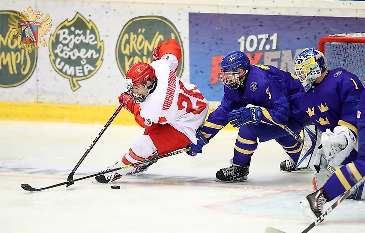 Голы: Рэймонд (Хенрикссон), 09:32 - 0:1. Хольмстрем, 25:53 - 0:2. Подколзин (Амиров, Хуснутдинов), 31:48 - 1:2. Амиров (Подколзин, Хуснутдинов), 40:20 - 2:2. Грошев (Ващенко), 50:22 - 3:2. Рэймонд (Хольц, Бромберг), 50:47 - 3:3. Рэймонд (Бреннстам, Юханссон), 65:44 - 3:4.