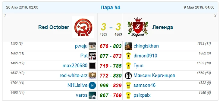 Как и в случае первой пары, и здесь победа Red October над Легендой на тоненького: всего 4(!) очка преимущества во 2-й паре и лишь +20 по фо. Странно, что имея запас замен, dimon0910 не разменял в последний день Пастернака на условного Гетла/Кутюра. Думаю, что ради прохода в следующий раунд, экономить замену уже и не стоило.