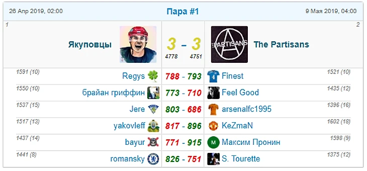 Якуповцы на тоненького прошли Партизан. По преимуществу в ничтожные 27 фо. Баталия за победу разыгралась на первой доске, где столкнулись Паша Regys с Finest. За три дня до окончания раунда Regys проигрывал 43 фо, за два дня - Regys уже имел преимущество в 24 фо, удачно сделав замены. За день до окончания уже было преимущество за Finest в 30 фо. В последний день удалось Regysу отыграть, но победа осталась за Finest. А вот по общему фо - Якуповцам. Игроки обеих команд прилично вложились в последний день, стремясь набрать побольше фо.