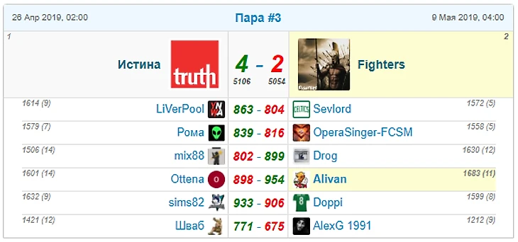 Истина заслуженно одержала победу в самом результативном матче раунда. Имея постоянно преимущество в 4-х парах, игроки Истины держали эти пары под контролем. Спокойно (хотя думаю и не без нервов) перенеся атаку Файтеров за несколько дней до финиша, но сохранив замены, Истина контролировала ситуацию до конца, перекрыв в последний день все возможные варианты проигрыша. Молодцы! Респект и Файтерам за борьбу до последнего. Тоже обидно вылетать, набрав 3-ю командную сумму фо.