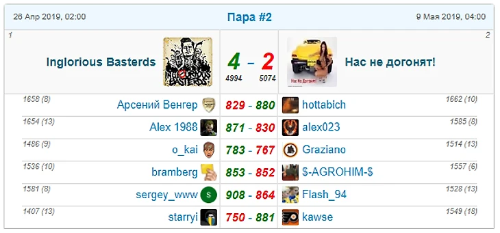 Победу Inglorious Basterds принесла удачная и грамотная игра o_kai и bramberg При отставании по командному фо, на эти пары была сделана ставка. Сохранив большее кол-во замен, обоим ублюдкам игрокам Бастердс удалось одержать победы и принести победу команде. Надо отдать должное и команде Нас не догонят! Они набрали 2-ю сумму фо, поэтому им очень обидно было проиграть из-за всего одного (!) очка в паре.