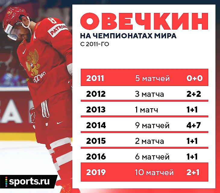 Только есть и другая сторона: он все же приехал на чемпионат мира, хотя, наверное, мог бы и не приезжать – отказаться, как это иногда делает уставший в клубе Малкин. Но Овечкин был на турнире, получал довольно много игрового времени, против лучших соперников и в большинстве, – и не помог команде. Сборная рассчитывала на него как на супернападающего – но не получила даже 50%.