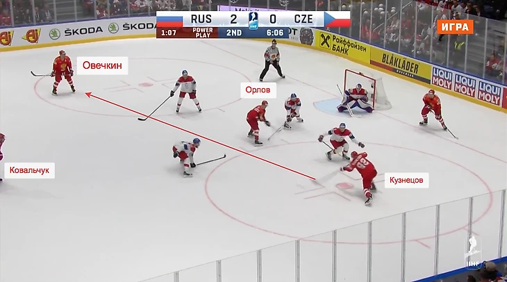 Задача всех остальных звезд в пятерке – включая Ковальчука – свелась к тому, чтобы замаскировать главный ход. Иногда это получалось лучше, иногда хуже, но в целом, все соперники знали, что рано или поздно пас пойдет на Овечкина – и тот будет бросать в касание. Вот классическая ситуация из первой игры с чехами: