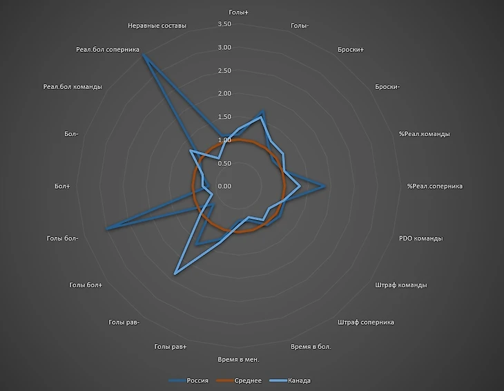 Как же назвать сравнительную диаграмму сборных России и Канады? Ничего лучше, чем "два брата-акробата" мне на ум не пришло...