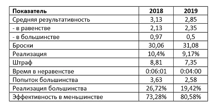 Список показателей для сравнения: общая результативность в среднем за игру, результативность в большинстве, кол-во пропущенных шайб в меньшинстве, общее количество бросков, процент реализации и спасений вратаря, количество штрафов, число попыток в неравных составах и общее время игры в неравных составах, а также эффективность реализации большинства и игры в меньшинстве, игра в неравных составах в целом.