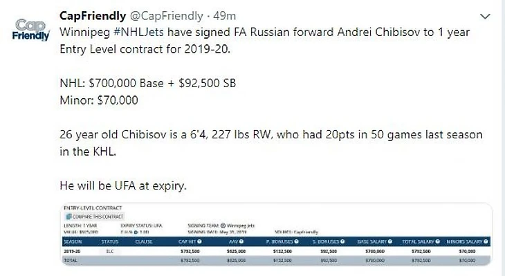 Нападающий Андрей Чибисов пополнил состав клуба НХЛ «Виннипег Джетс». Как сообщает агентство CapFriendly, 26-летний форвард заключил однолетний контракт новичка. За сезон Чибисов заработает 700.000 долларов без учёта бонусов.