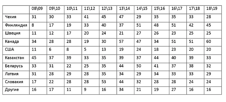 На данной таблице вы можете отследить количество легионеров из разных стран в каждом отдельно взятом сезоне Континентальной Хоккейной Лиги. Я лишь заострю ваше внимание на ключевых моментах.