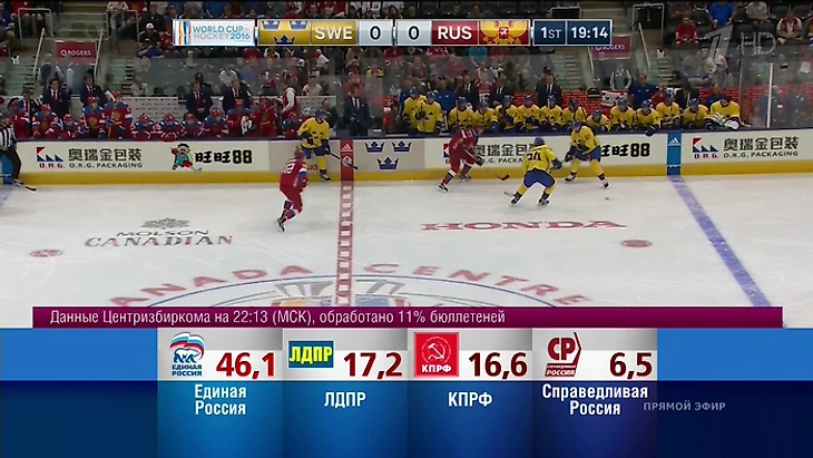 НХЛ соизволила к 2016 году возродить Кубок мира. Под такое событие даже «Первый» купил права на трансляции. И вот я тихо-мирно ночью включаю матч Россия — Швеция. Меня здесь политика не достанет? Держи карман шире — получи результаты голосования на выборах в Госдуму.