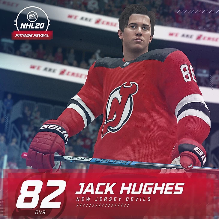 Первый номер драфта 2019 года - Jack Hughes ( New Jersey Devils ) получил общий овер - 82 в симуляторе NHL20 .