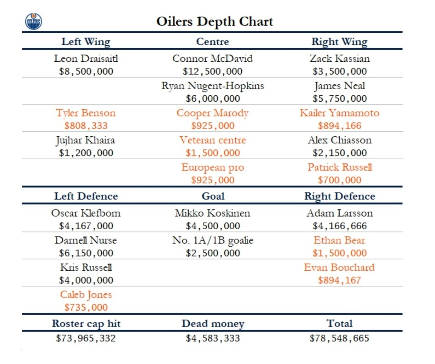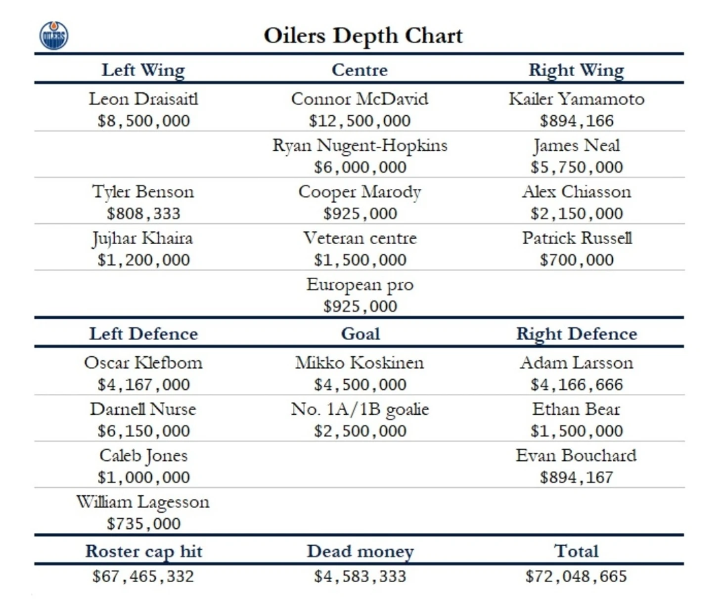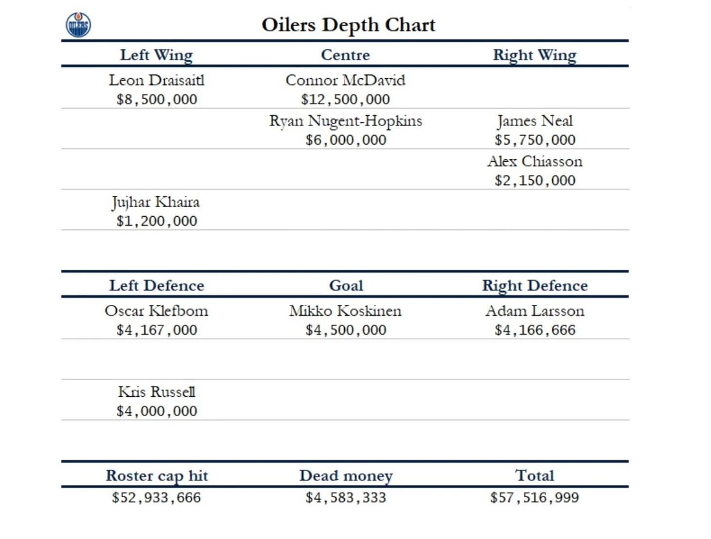 На сегодня у «Нефтяников» есть 10 игроков на контрактах НХЛ в сезоне 2020-2021. Зарплаты этих хоккеистов вместе со штрафами по выкупу Бенуа Пулио, Андрея Секеры, а также удержанной частью зарплаты Милана Лучича позволяют нам утверждать, что «Эдмонтон» уже потратил 57,5 млн. долларов в следующем сезоне, не подписав ни одного нового игрока.