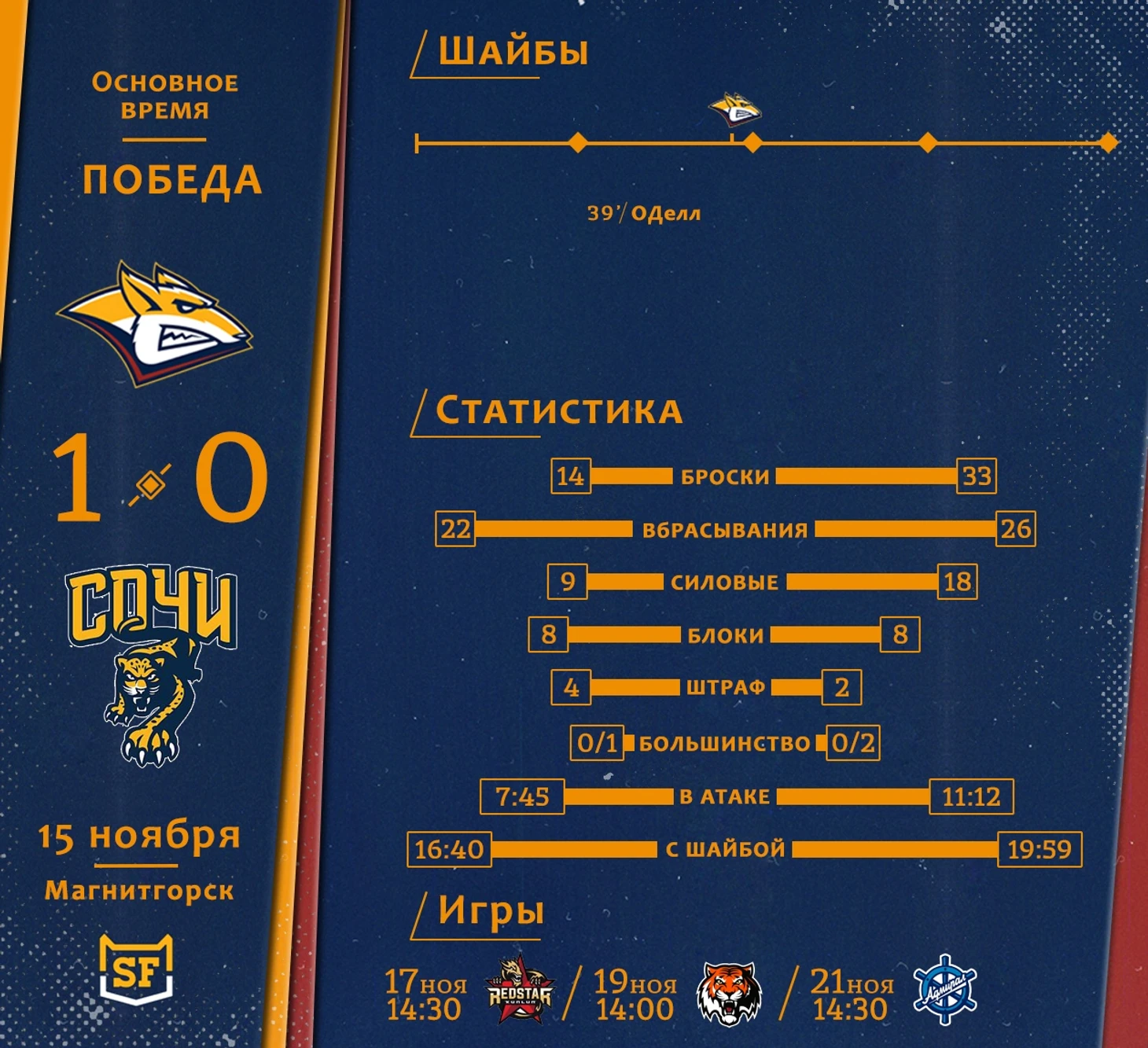 Единственная шайба Эрика ОДелла в матче с ХК «Сочи» и 5 победа подряд
