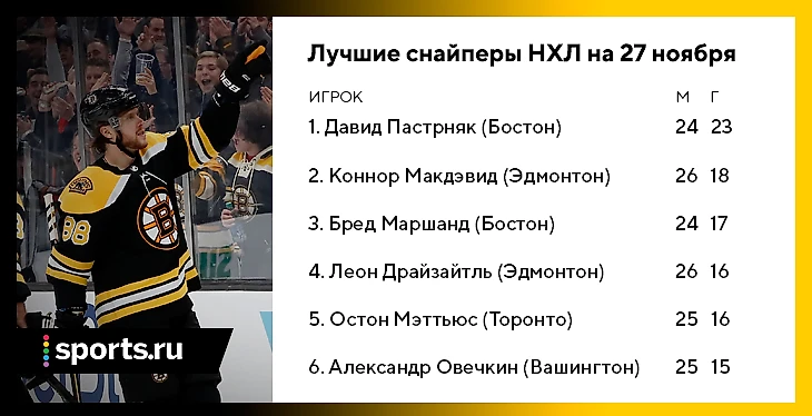 Пастрняк – главный снайпер старта регулярки. У него отличные партнеры, он набрал идеальную форму и положил 23 шайбы в 24 матчах – разными стилями. Что-то подставлениями, что-то из проходов, что-то – уантаймерами из левого круга: это реально одаренный финишер. В снайперском топе НХЛ его отрыв от второго места – 5 голов, причем у Макдэвида на 2 игры больше.