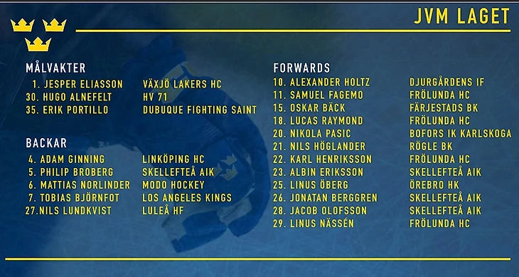 Томас Монтен обожает брать на МЧМ 18-летних игроков для набора опыта, однако в предварительной заявке сборной Швеции на чемпионат в Чехии числится лишь один нападающий, родившийся в первый год XXI века. На юниорском первенстве в Эрншёльдсвике команда "Трёх корон", собранная исключительно из хоккеистов 2001 года рождения вряд ли смогла бы пройти дальше стадии четвертьфиналов, и основная причина, по которой в апреле Броберг и Бйорнфут получили от ИИХФ золотые награды, кроется в наличии у них под рукой Рэймонда и Хольца, в одном только финале умудрившихся организовать три голевые атаки, убрав с дороги сборную России и вместе с ней Ярослава Аскарова.