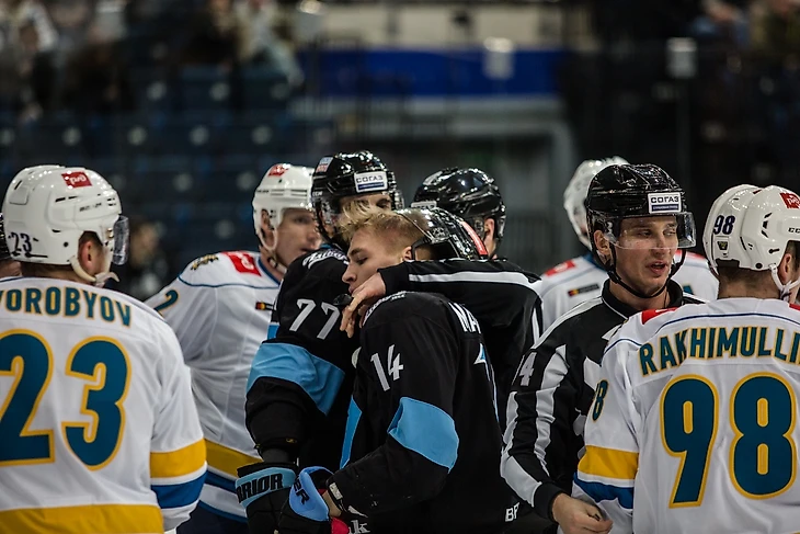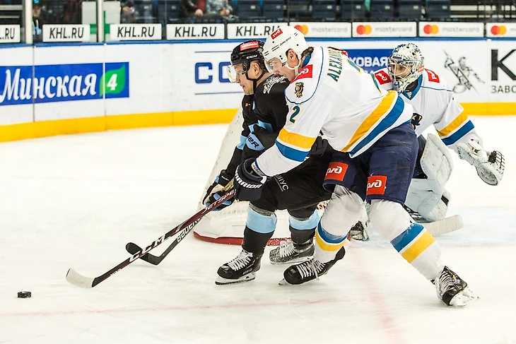 Атака минчан. Стремвалл смело кидается под коньки нападающего минчан, а Алтыбармакян подставляет себя под бросок Граньяни.