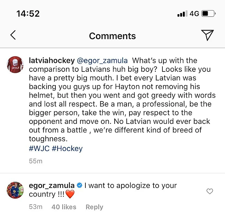 «Что за сравнения с латышами, большой парень? Похоже, у тебя довольно большой рот. Можем поспорить, что каждый латыш поддерживал вас, ребята, когда Хэйтон не снял шлем, но потом вы стали слишком разговорчивыми и потеряли всякое уважение. Будь человеком, профессионалом, будь большим человеком, возьми победу, уважай соперника и двигайся дальше. Ни один латыш никогда не отступит от битвы, мы другого тип жесткости», – написали в аккаунте @latviahockey.