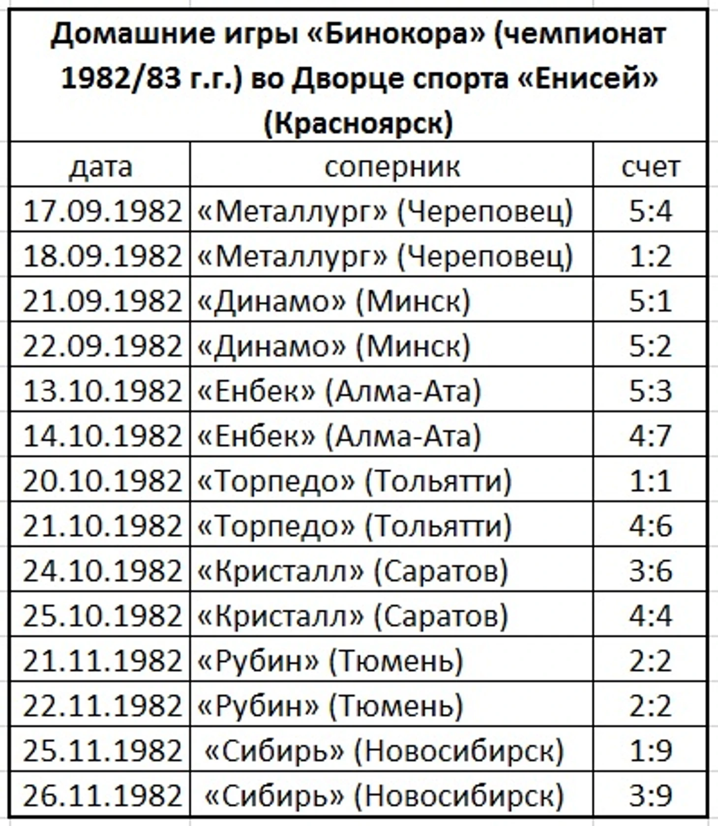 Среди множества различных спортивных сооружений, в которых хоккеисты «Бинокора» (ранее «Спартака») из Ташкента проводили матчи в других городах, одно стоит особняком. Речь о Дворце спорта «Енисей» в Красноярске. В нем «Бинокор» в чемпионате 1982/83 годов, в связи с завершающей стадией ремонта в собственном дворце ЦЗС «Юбилейный» и вводом в действие нового тренировочного катка, на правах хозяина принимал своих соперников. Тогда «зодчие» провели в Сибири четырнадцать домашних матчей (+4; =4; -6; разница шайб 45-58).