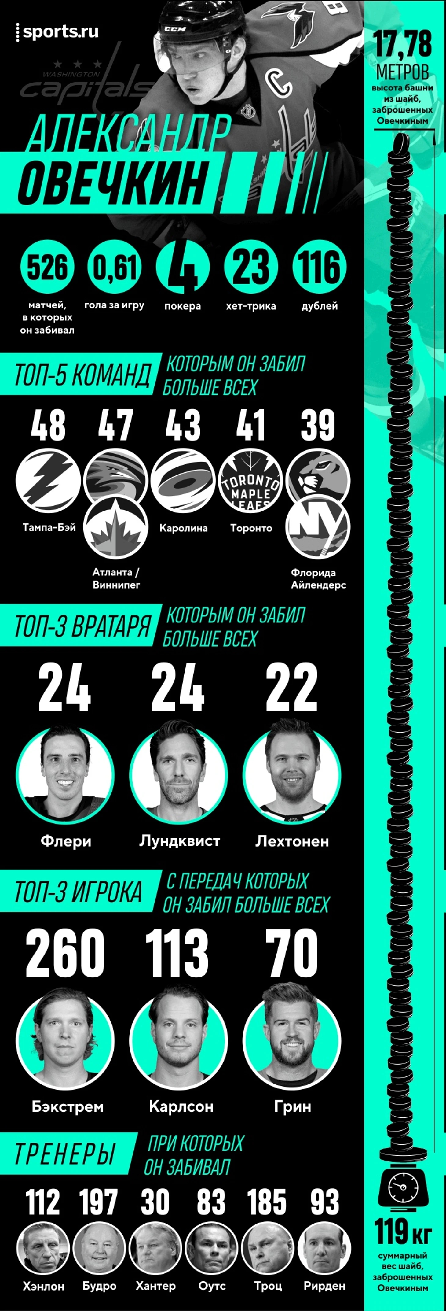 700 голов Овечкина в одной картинке: башня из шайб, кто помогал, кто пропускал