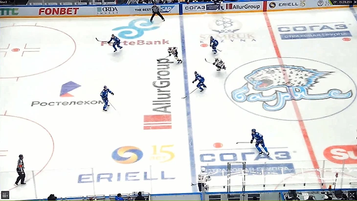 Барыс отбросился, замениться успел лишь один нападающий (на дальнем плане). Найт был на льду уже почти минуту: с одной стороны, смена переиграна, а с другой, можно было двигаться чуть быстрее и занять позицию не у центрального круга.