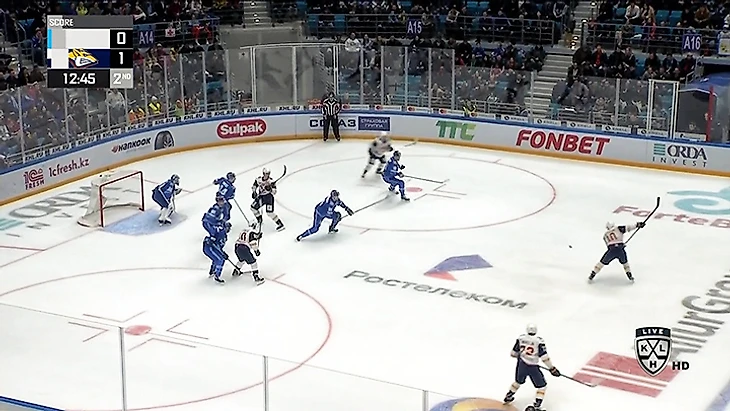 Снова много свободного льда, момент похож на второй гол Барыса из первой встречи. Только здесь защитник изначально был ближе и мог сделать нечто большее, чем поставить клюшку на пути броска. Причём на повторе кажется, что шайба даже зацепила крюк клюшки и это могло смутить голкипера. В любом случае, вратарю эту шайбу надо было брать, но гол возник не на пустом месте, а из-за суммы нескольких факторов.