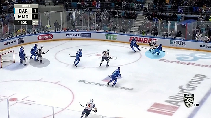 Атаки Металлурга шли как минимум против троих соперников. Даже если Барыс атаковал всей пятеркой, после потери трое быстро отскакивали назад. Магнитка атаковала 2 в 3 или 3 в 3, в лучшем случае.