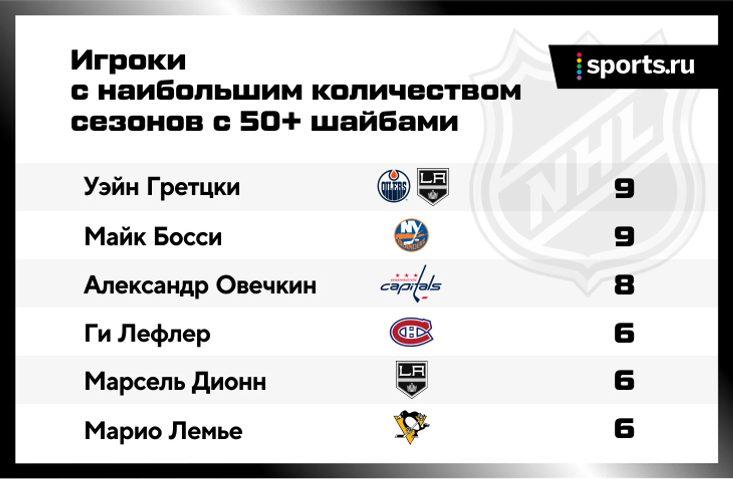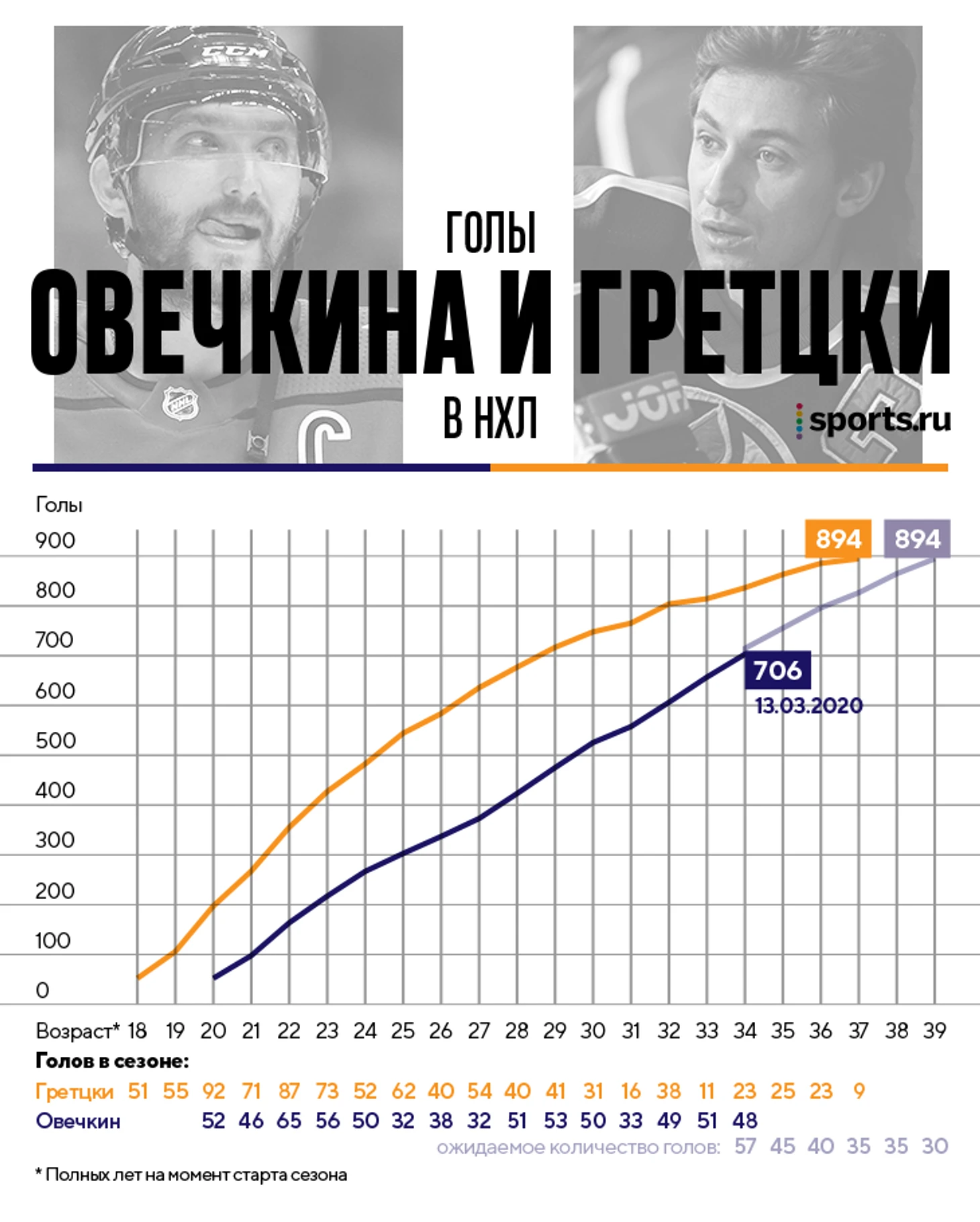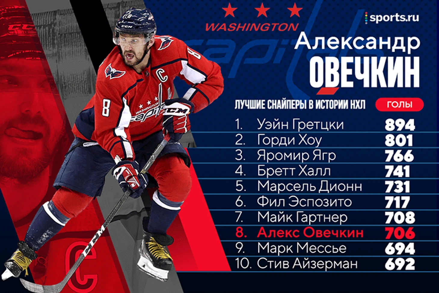 Эта одна из главных интриг последних (и следующих) сезонов в мировом хоккее. За три года Овечкин так сильно продвинулся в историческом списке снайперов (скакнул с 28-го места на 8-е), что обгонял легендарных игроков чуть ли не каждую неделю. Разговоры о том, что Александр станет лучшим в истории звучат все громче и увереннее: Ягр не сомневается, что Овечкин побьет рекорд, а сам Уэйн подбадривает конкурента в твиттере и ждет очередного юбилея.