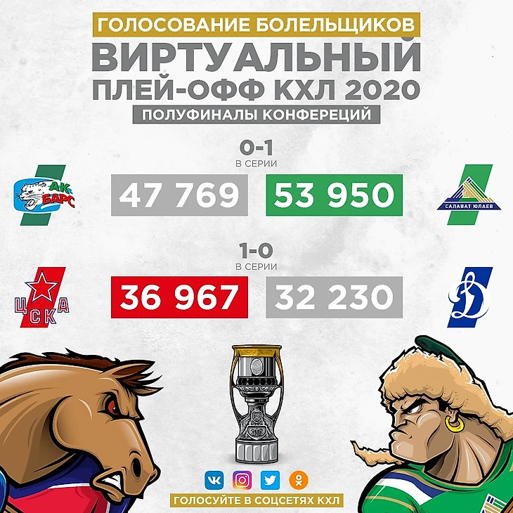 ЦСКА и «Салават Юлаев» набрали больше голосов болельщиков в ВК, Twitter, Одноклассниках, сторис Instagram и выиграли первые «матчи» виртуального плей-офф!