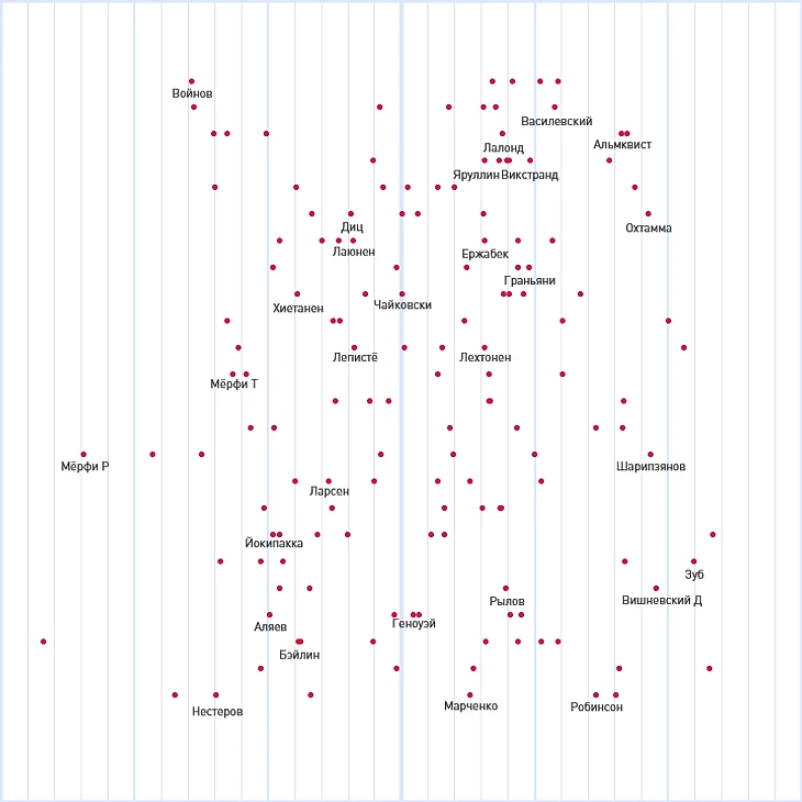 Стоит упомянуть и о набранных очках. Здесь отмечены фамилии 30 лучших защитников-бомбардиров. Чем левее на графике хоккеист, тем чаще при нём пропускает команда, относительно её среднего показателя. И наоборот, чем правее – тем реже. Таким образом, можно увидеть реальную полезность результативных игроков обороны.