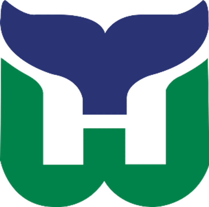 Логотип «Хартфорд Уэйлерс», используемый с 1979-й по 1992-й. Он объединяет зеленую букву «W», напоминающую трезубец, с хвостом синего кита, две эти фигуры по центру создают букву «H». «W» обозначает Whalers, а «H» обозначает Hartford. Логотип был обновлен в 1992-м небольшим затемнением цветов и добавлением серебряного контура