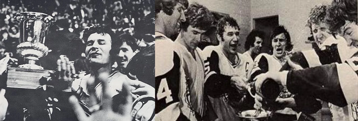 Первый капитан в истории франшизы Тед Грин с запасным трофеем на льду после победы и празднование игроков «Уэйлерс» в раздевалке, 1973-й