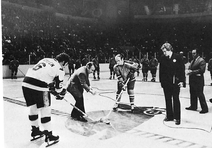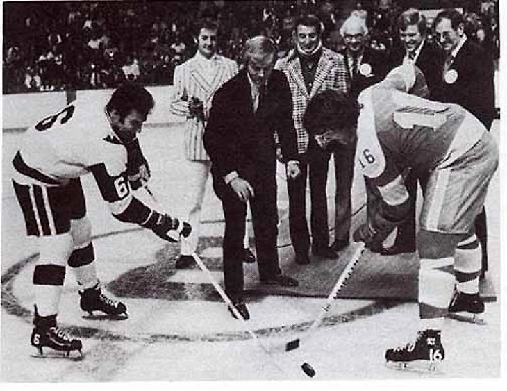 Торжественное вбрасывание между капитаном Тедом Грином и Дереком Сандерсоном из «Филадельфии Блэйзерс» в первой игре в истории «Уэйлерс». Обратите внимание на логотип «Брюинз» в центре льда, 1972-й