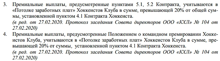 В переводе с отвратительного канцелярского языка на человеческий, клуб вправе выплатить игроку премиальные в размере 20% от оклада за индивидуальные достижения (например за определённое количество заброшенных шайб, передач, блокированных бросков и т.д.) и эти премиальные не будут учитываться под потолком. Точно так же клуб вправе выплатить 20% премиальных за командные достижения (например за победу в регулярном чемпионате, выход в финал КГ, завоевание КГ и т.д.). Командные премиальные также не учитываются под потолком. Под потолком учитываются только дополнительные премиальные, превышающие 20% от оклада.