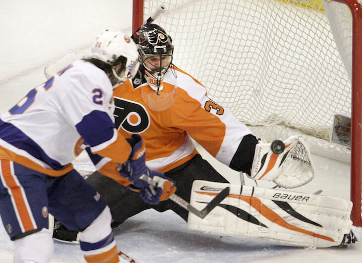 В «Филадельфии» этого не было – другая философия, тренер хотел, чтобы защитники блокировали шайбу. Для чего? Я потерял контроль, это выбивало меня из своей тарелки. Передо мной стоят два защитника наших, плюс нападающий – она попадает в трусы, щитки, отскакивает на клюшку, а ты ничего не видишь и садишься, как слепой котенок. Когда три тела перед тобой стоит, это надо уезжать в угол, чтобы ее найти».