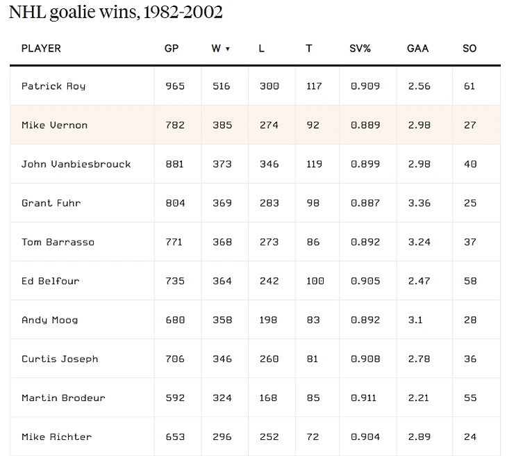 Вернон занимает 16-е место по победам среди всех вратарей за всю историю Лиги - их у него 385. Но на его счету также 92 ничьи в матчах регулярки. Если бы он играл сейчас, где нет ничьих, - только победа или поражение - то он с легкостью смог бы добавить минимум 50 побед к своим 385.