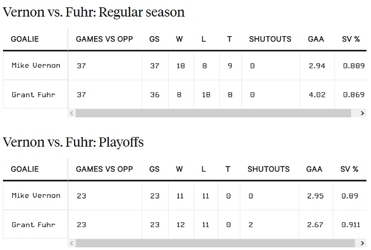 Но вы можете сравнить игроков с теми, кто играл в то же время, что и они, взять статистический контекст эпох. В противостоянии с двумя вратарями, которые уже в Зале Славы, Вернон вышел победителем в каждом из них. И Руа, и Фюр в Зале - их место там по праву.