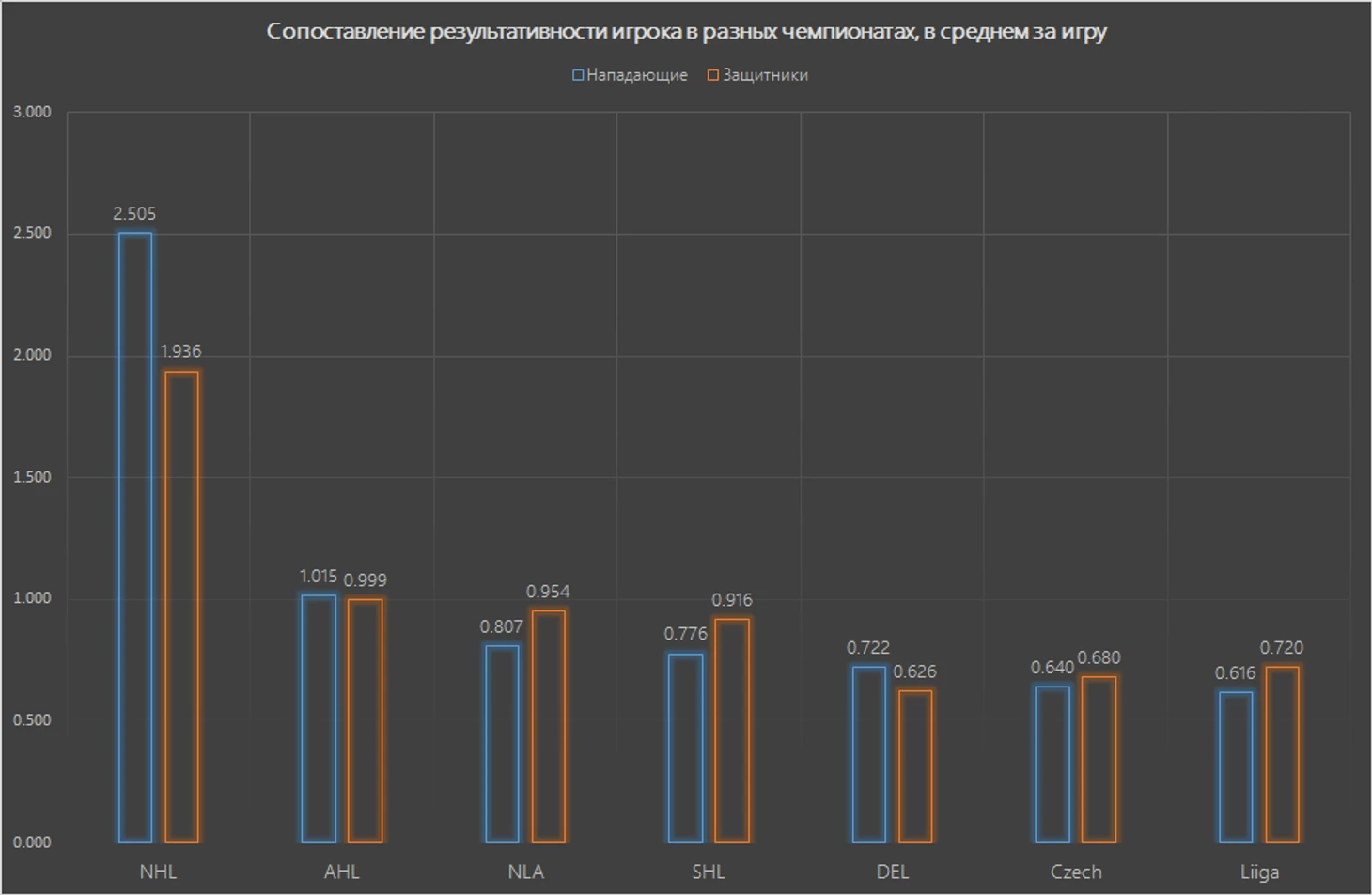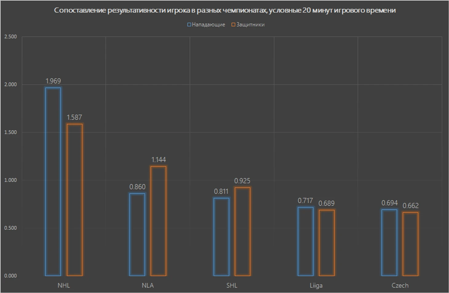 Как и в прошлый раз, для КХЛ значения равны единице, следовательно, коэффициент показывает сколько в среднем очков в КХЛ набирал игрок, имеющий 1 результативный балл в своём регулярном сезоне. К примеру, нападающие на каждое 1 очко в НХЛ в нашей лиге показывали 1.696 балла и так далее.