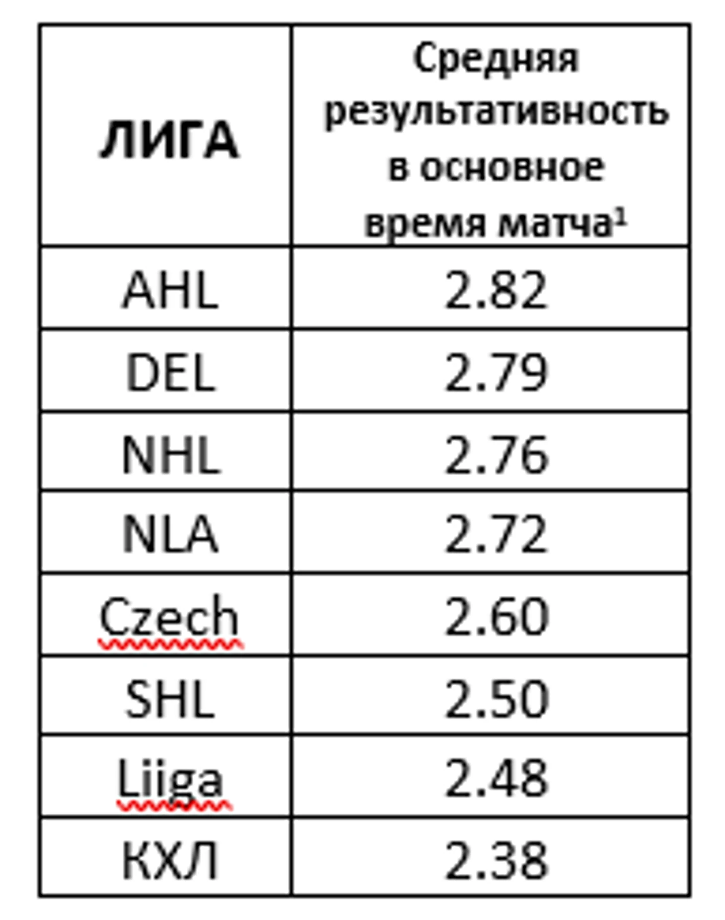 Казалось бы, всё хорошо: судя по этим данным, КХЛ действительно превосходит прочие хоккейные лиги мира, уступая лишь НХЛ. Однако, нужно помнить про различную среднюю результативность сезона в разных чемпионатах, которая, безусловно, искажает итоги.[1]